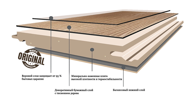 В структуре MSPC ламината нет ПВХ и ни одного из 40 вредных веществ, представляющих опасность для здоровья человека. Наша компания готова предоставить все испытания по эмиссии согласно тестам СанПиН. MSPC ламинат Stone Floor безопаснее натуральной древесины даже при повышенных температурах, когда эмиссия резко усиливается.